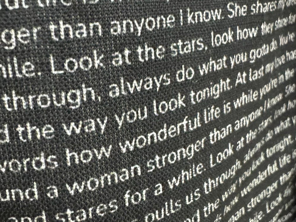 Yes! We use high-quality printing techniques that ensure your lyrics stay crisp and clear through regular washing. For best results, wash inside out in cold water and hang dry. Your special lyrics will remain vibrant wear after wear.