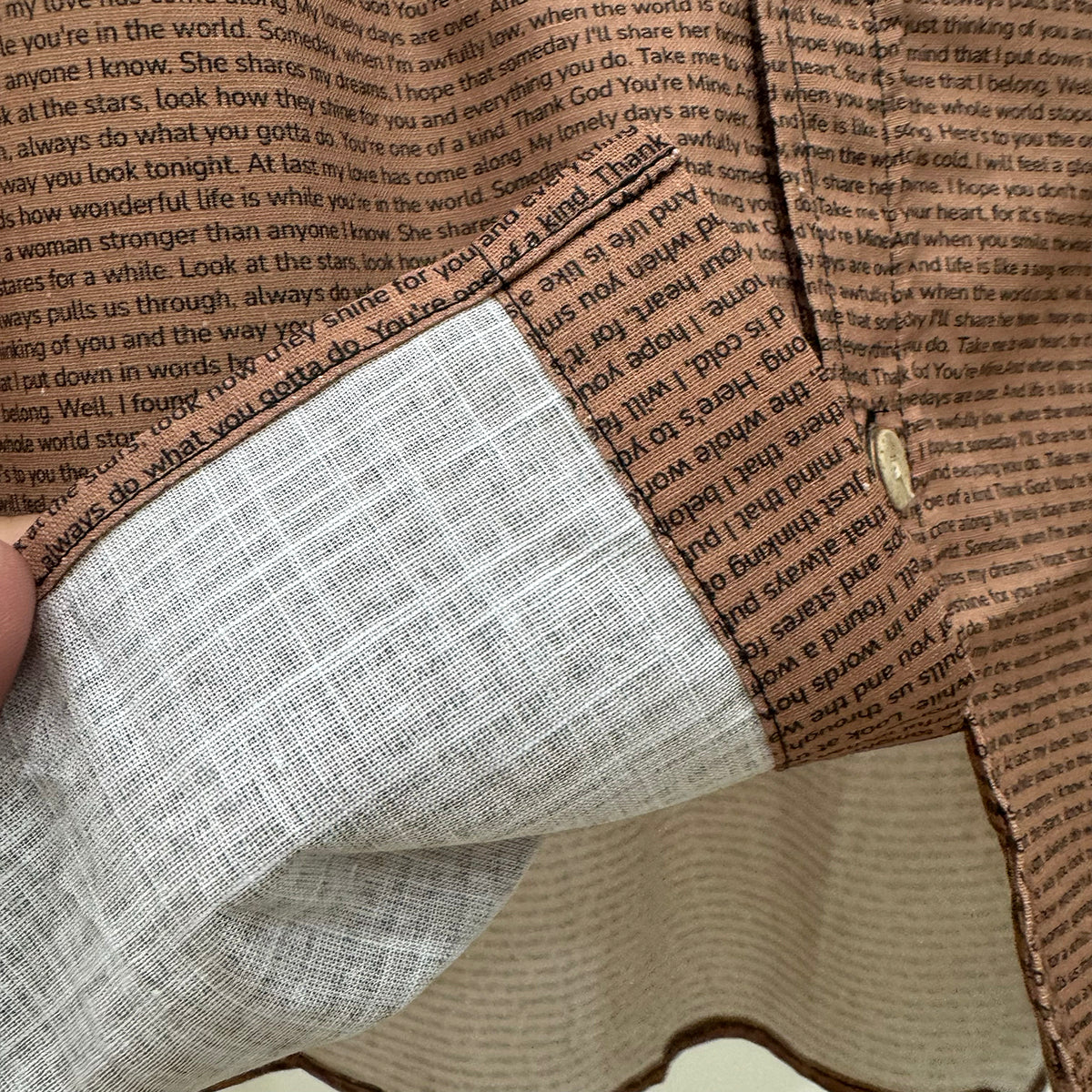 Bought this for my sister's birthday with lyrics from our childhood favorite song. The cotton fabric is luxurious, and the coconut buttons add such a nice touch! She wears it constantly and says it's comfortable enough for casual days but elegant enough for dinner out.